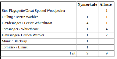 Hans havde forudsagt at det ikke blev en stor ringmærkningsdag med frisk vind fra vest og temperaturer på 15 gr og han fik ret: En meget stille dag. 9 fugle ringmærket og ligeledes 9 stk aflæst.
