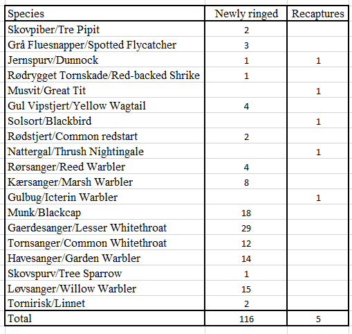 At the lake we had this day 4 Yellow Wagtails, one Linnet and one Tree Sparrow. In total 19 species and 121 captured birds of which 116 new and 5 recaptures.