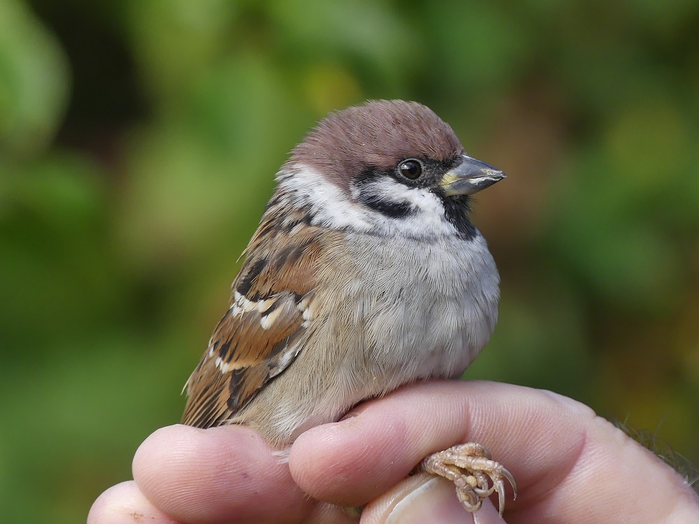 Many of our longer stayers appear to have moved on before the rain as there were so few retraps compared to the last few days. We continued to catch into the early afternoon, one round included a mixed group of House Sparrows and Tree Sparrows, all in one of the high nets. The House Sparrows were definitely passing through and carrying a lot of fat, while the Tree Sparrows had virtually none. The capture of all 13 birds together certainly indicates that there was some form of interaction while they were sharing the garden.