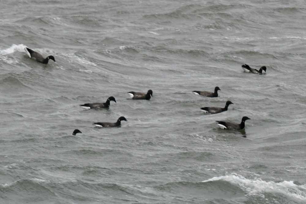 Mørkbugede Knortegæs (Dark-bellied Brent Geese) og Ederfugle (Common Eiders) passerer Danmarks sydligste punkt på vej fra Østersøen ind i Femerbælt torsdag formiddag. Foto: Ole Friis Larsen
