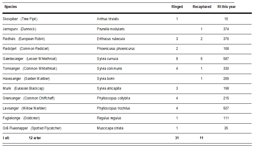 Today was a bit better than yesterday. In total 39 birds: 35 new and 4 recaptures. Half of the birds were Chiffchaffs (Gransanger) and we caught 4 Redstarts (Rødstjert) all young males.