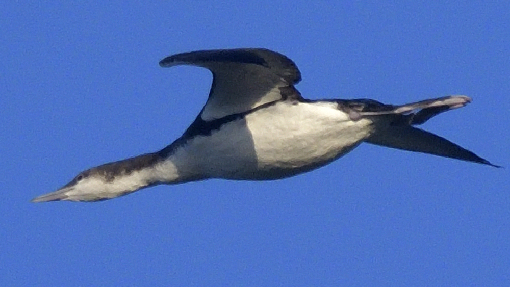 Også dagens oplevelser med lommer var yderst spektakulære med de Sortstrubede Lommer (Gavia arctica) i klart overtal. Især var det flot med en flok på fem, som passerede lige over vores observationspost i flot lys, og vi tydeligt kunne skelne to adulte/voksne fugle fulgt af tre juvenile/unge fugle fra i år, altså antagelig en ’familie’ på træk sammen. Det samme så vi lidt længere ude i en gruppe på seks med to adulte fugle stadig i sommerdragt fulgt af fire unge.