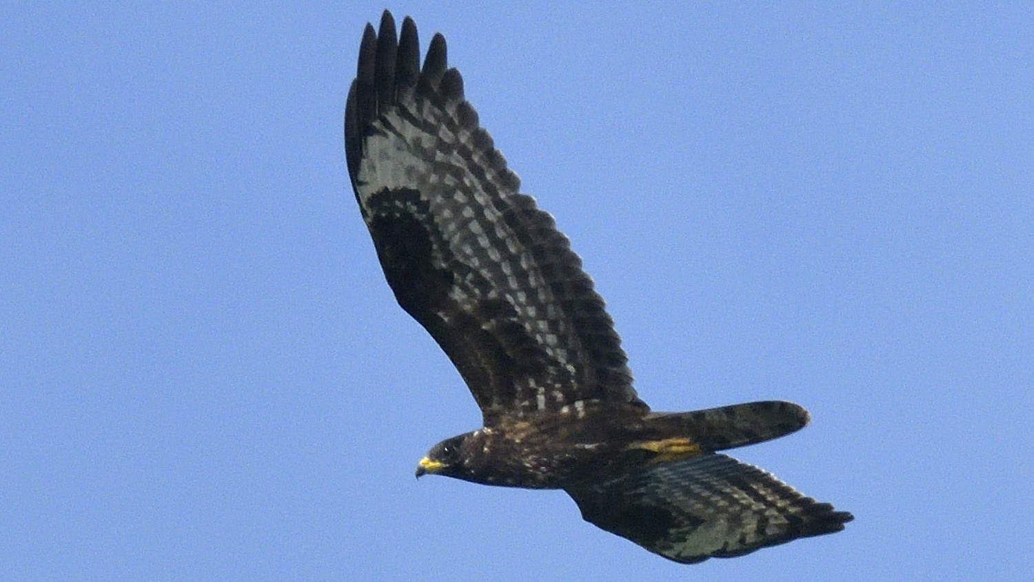 Oktober er sidste udkald for at se Hvepsevåger i Danmark i år, og det varer ikke mange dage, før alle er væk. Ikke desto mindre havde vi flere unge Hvepsevåger på udtræk søndag formiddag. Her er en af dem. Bemærk lille sort næb, meget gul vokshud og mundvige samt smalle næsebor. Foto: Ole Friis Larsen/GFU