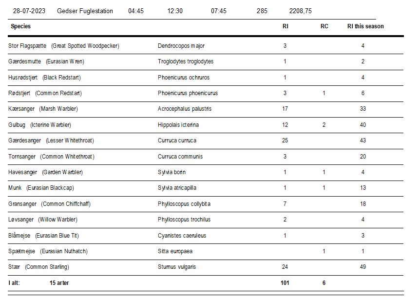 Dagens ringmærkning og kontroller/Todays ringing and recaptures: