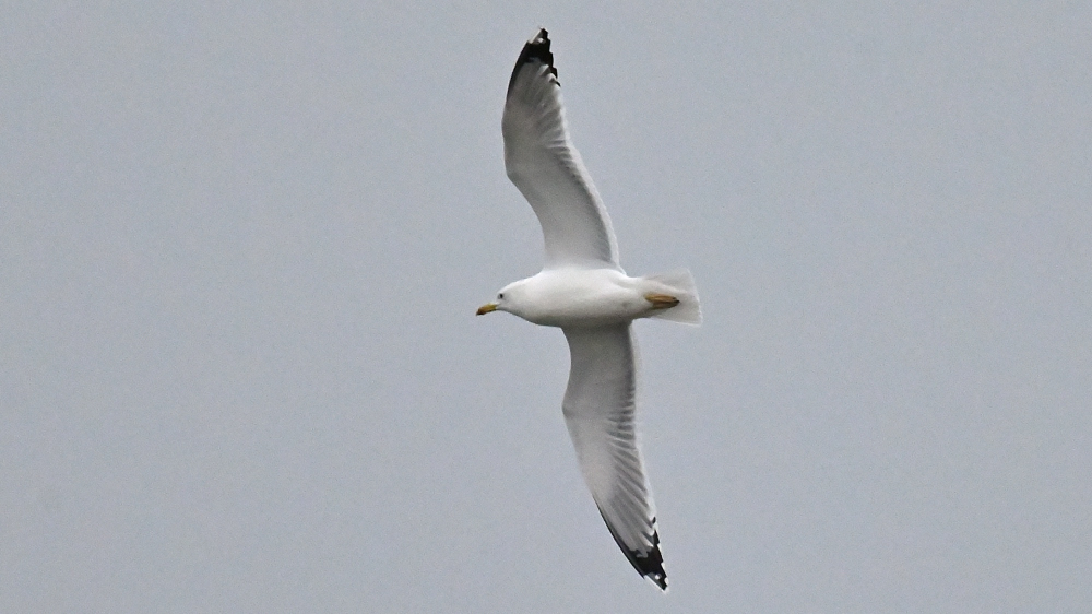 GFU dec man 2364En af mandagens adulte/voksne Kaspiske Måger. Bemærk det rent hvide hoved med mørkt øje, det lange tynde næb, og at kun den yderste store vingefjer, som vi kalder P10, har et større hvidt felt på den sorte spids. Foto: Ole Friis Larsen/GFU
