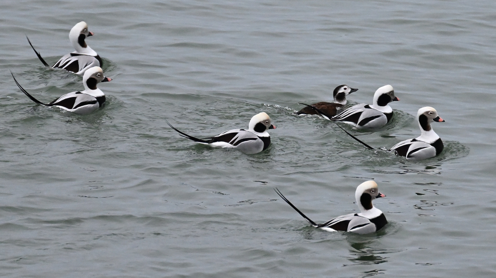 Således var der lidt trafik af flere arter af gæs, et pænt ryk af Ederfugle (Somateria mollissima), som var svært at skille ud fra alle de rastende fugle, der flytter sig på havet. Lommer var der ikke mange af, men der var fint mange Toppede Skalleslugere (Mergus merganser), som stadig passerer talrigt tæt forbi Odden og er lette at opleve med deres farvestrålende, torpedoformede og hurtige flugt.