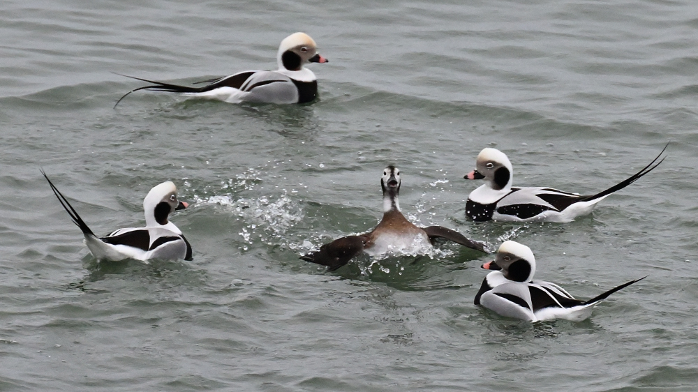 På havet var der færre rastende fugle end i de seneste foregående dage, men en flok Havlitter (Clangula hyemalis) sørgede for god underholdning i et spil, som bragte dem tæt på land. En flok hanner så ud til at sværme om en enkelt hun, som tydeligt holdt sig til en enkelt han og højlydt afviste alle de andre, ind imellem angreb hun endda nogle af hannerne fysisk. En del af det interesssante var, at den udvalgte han overhovedet intet gjorde for at hjælpe hunnen eller forsøge at jage andre hanner væk.