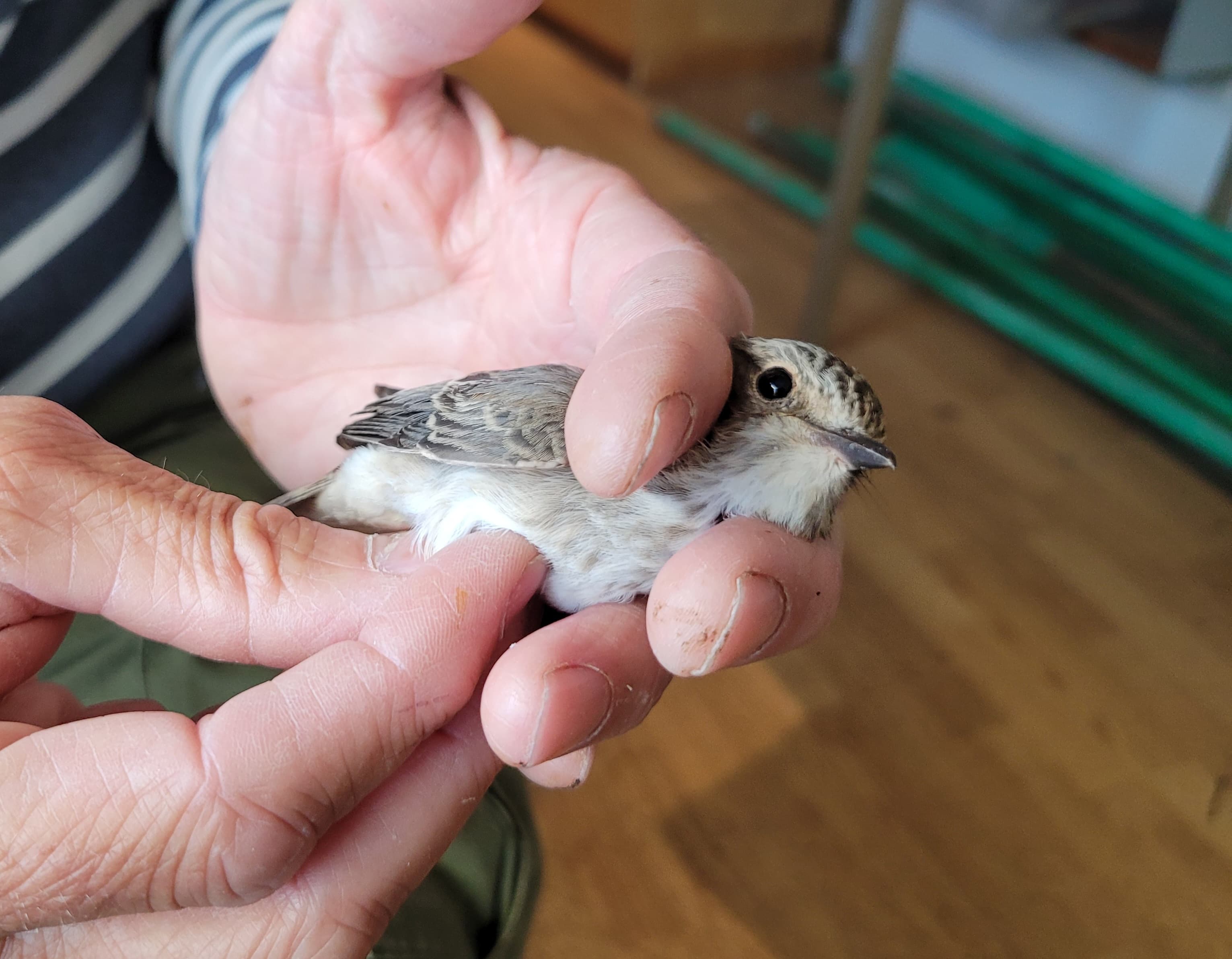 Almost no wind and a clouded sky. So good for catching birds. But there were only a few birds in the gardenand even less flew into the nets. We had in total 12 bird (8 new and 4 recaptures). Highlights of the day were two new Icterin Warblers (Gulbug) and a Spotted Flycatcher (Grå Fluesnapper). Of these two species you can find a pictures below.