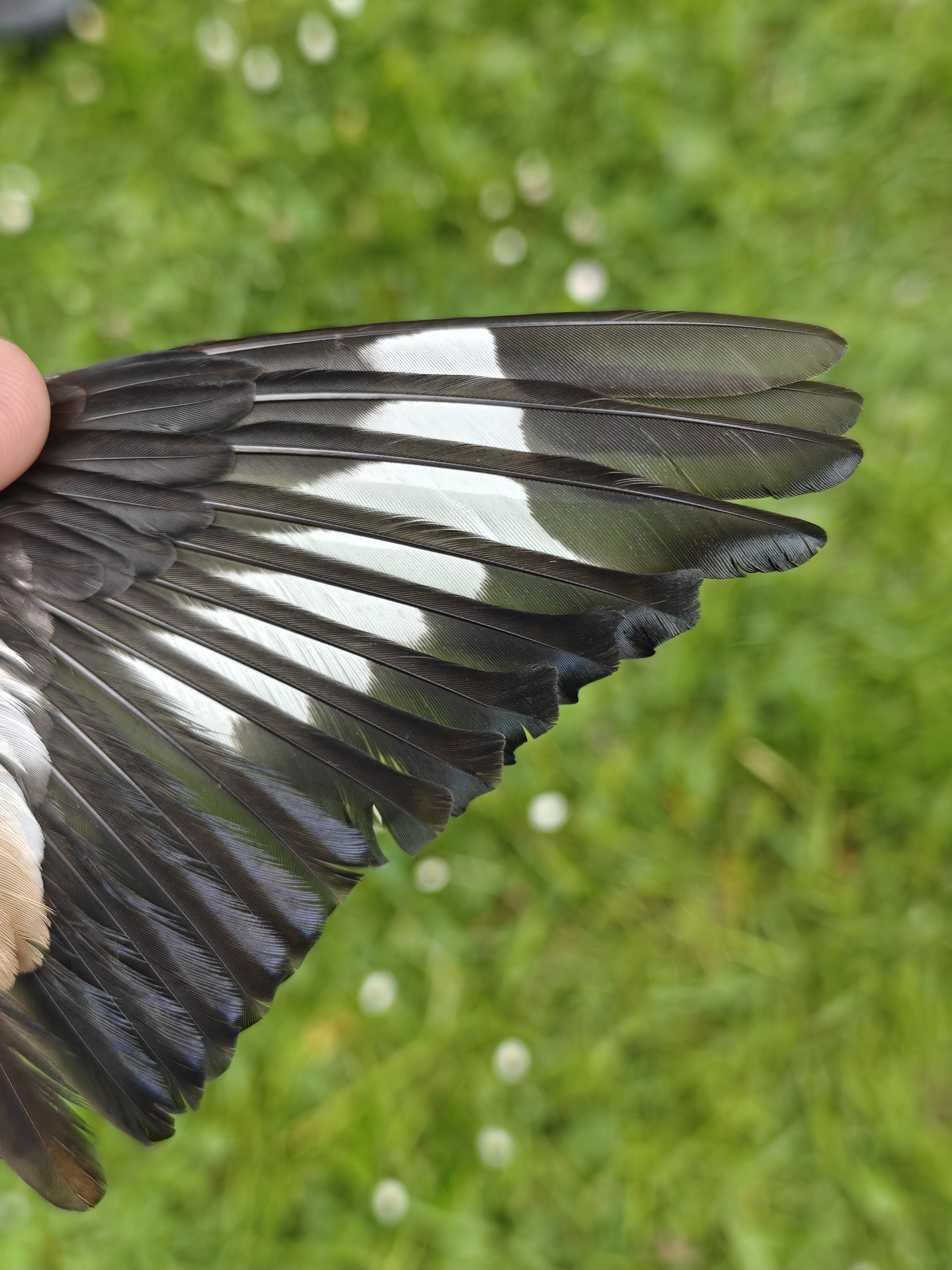 Vinge af kernebider 3k+ han. Læg mærke til de meget skinnende sort/blå/metalliske ydre dele af sekundære svingfjer, som er en af de sikre tegn på, at fuglen er en han. De brede, kølleformede primære svingfjer, samt skinnende sort/blå/metalliske på tredje og fjerde primære svingfjer, er tegn på at fuglen er en voksen (3k+).